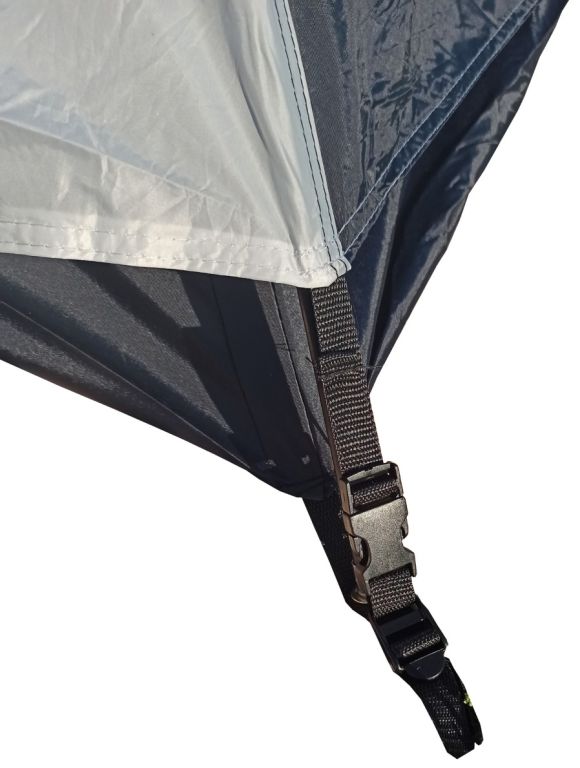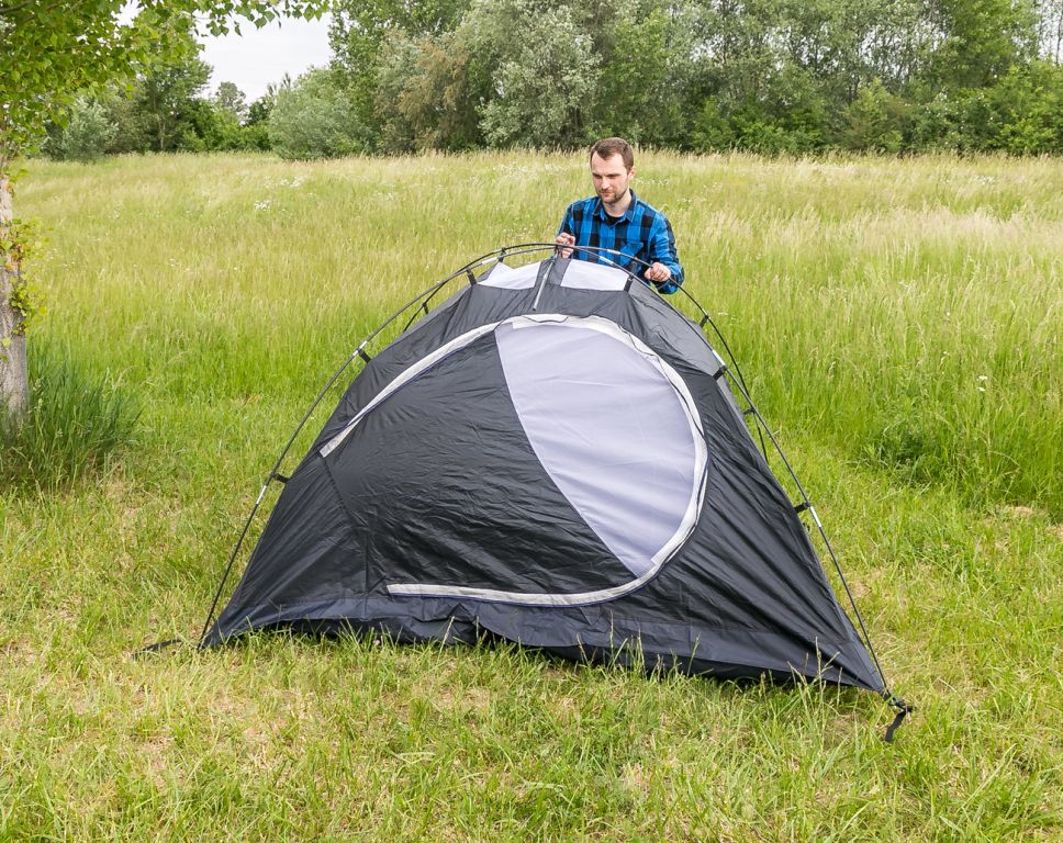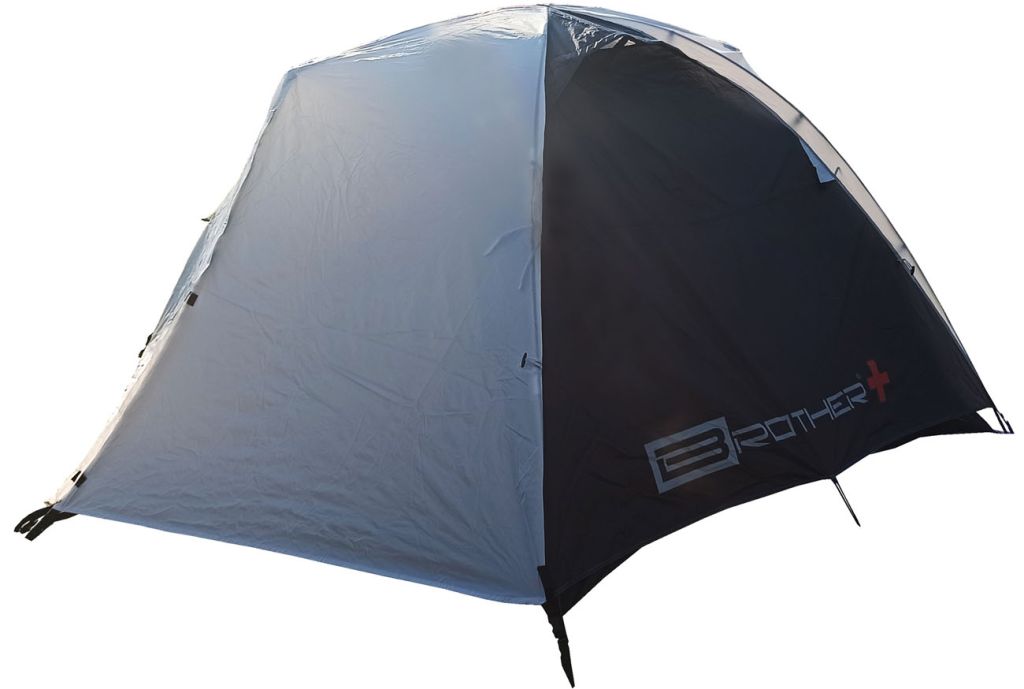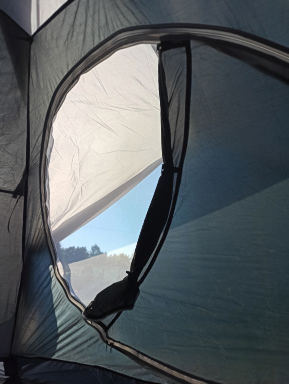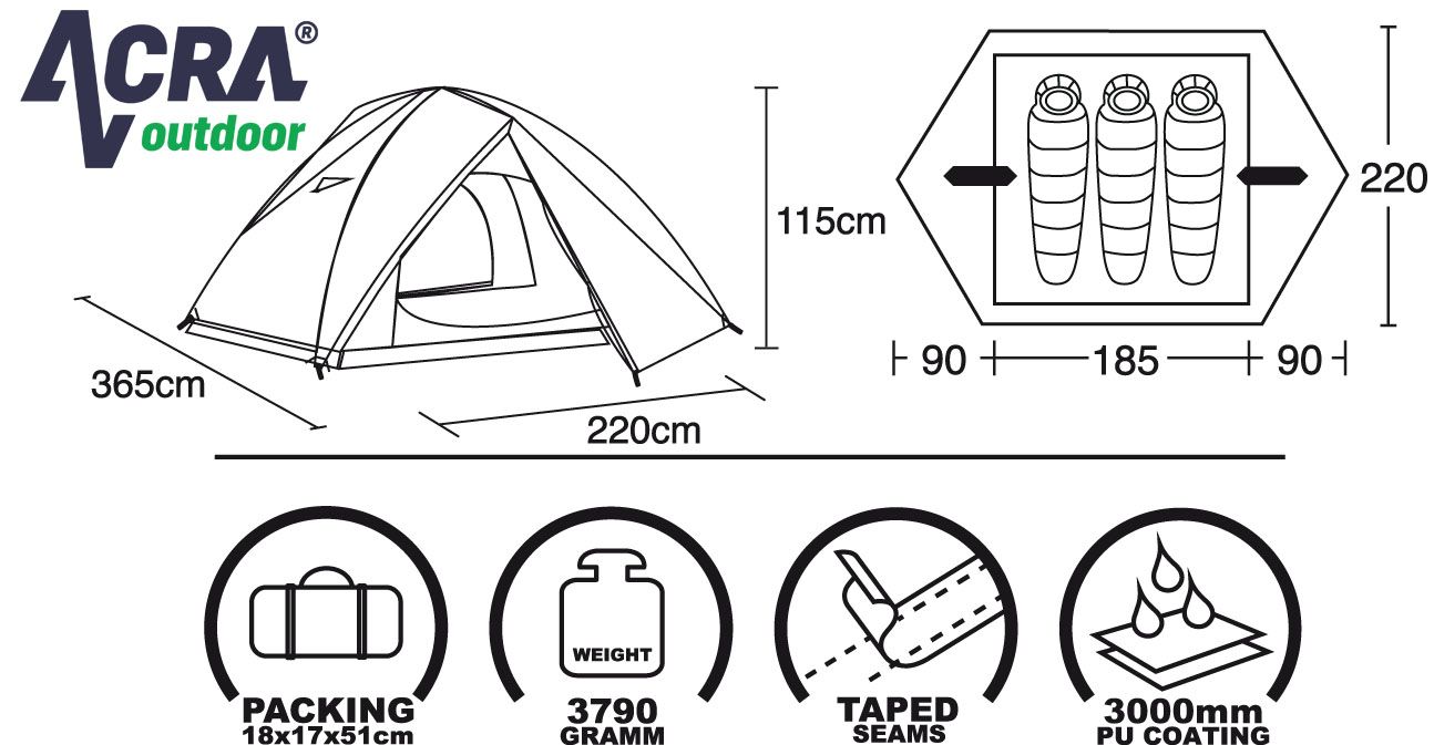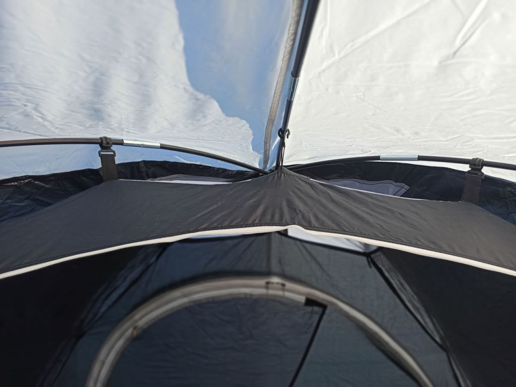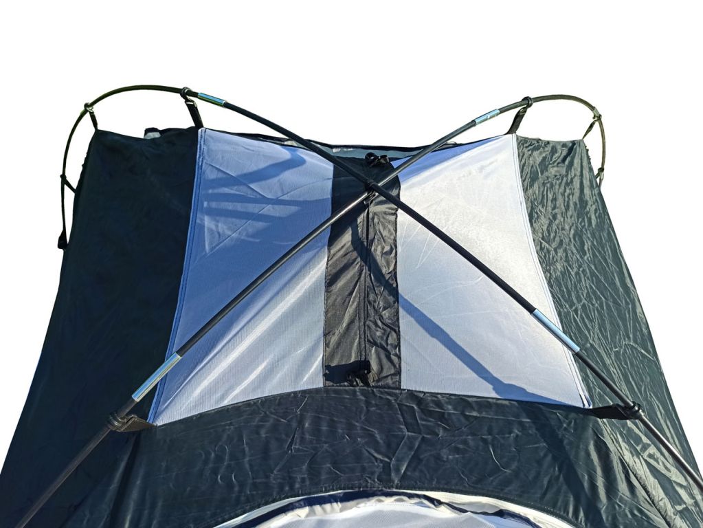 3 személyes kupola sátor - duplafalú kupola első és hátsó bejárattal (függesztett hálószoba és elkülönített felső kupola), előszoba, mindkét bejárat előtt cipzárral, megerősített varratok a lezárásához, 3000 mm víz. oszlop, 210D PU OXFORD al, a sátorban egy függesztett hálószoba és egy üvegszálas tartórudakra húzott felső kupola.