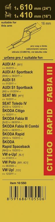 Lapos ablaktörlő szett, csatlakozás típusa: különleges a meghatározott modellekhez, Ez a ablaktörlő szett a Škoda Fabia III, Rapid, VW Polo, Seat Mii típushoz alkalmas.