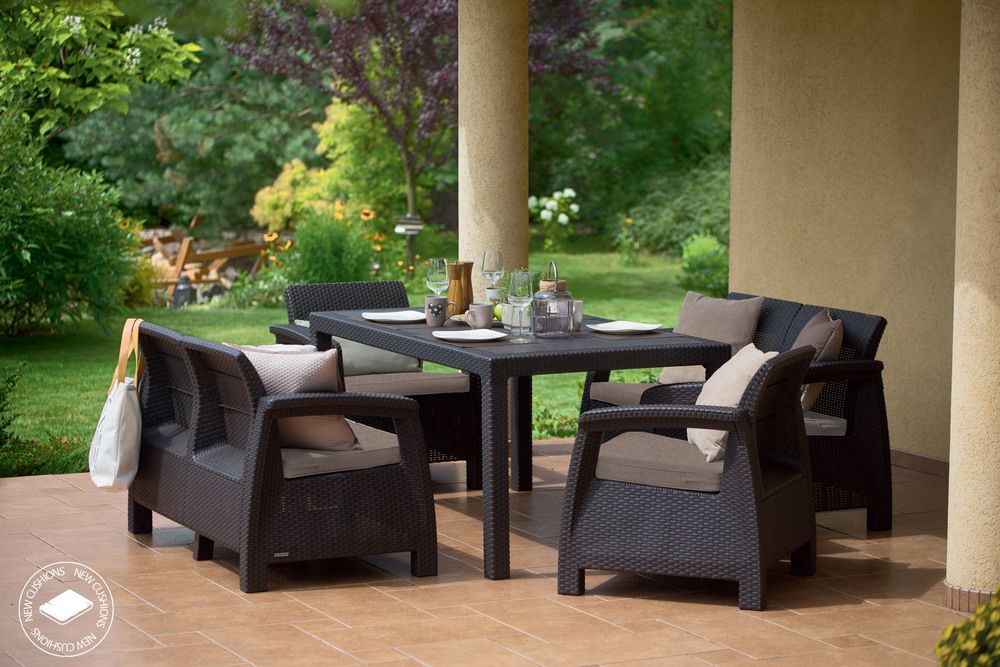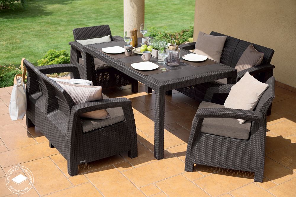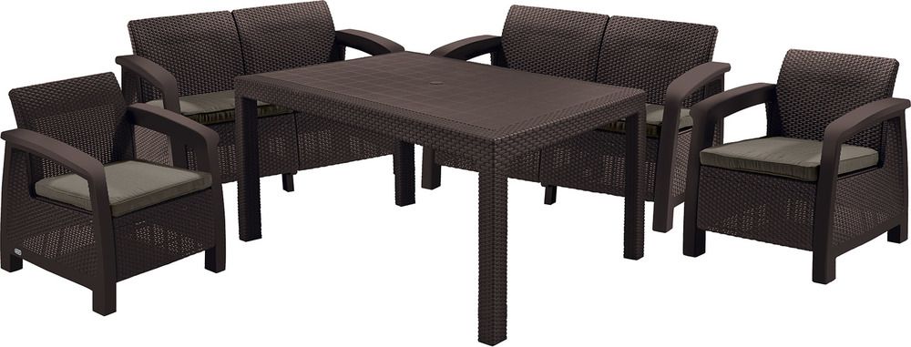 Nagyobb készlet CORFU FIESTA egy modern ülés kültérbe vagy beltérbe. A készlet sajtolt műanyagból va gyártva lapos rattan utánzattal. A készlet tartalmazz párnázást, amely biztosítja a még nagyobb kényelmet. Ez egy nagyon népszerű készlet.Összeáll nagy asztalból, 2 karosszékból és 2 kétüléses kanapéból. Egyszerű összeszerelés és karbantartás. Kiváló minőségű, ellenáll kellemetlen időjárásnak.