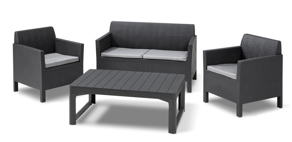 Bútor készlet Orlando préselt műanyagból készült - rattan imitáció. Ez a szett alkalmas úgy kinti használatra, ugyanis ellenál az időjárás viszonttagságainak és az UV sugárzásnak is, alkalmas mint stílusos ülőalkalmatosság az interiében is. A készlet részei két fotel, kanapé és egy négyszögletű asztal. Hogy a szett még kényelmesebb legyen magában foglaljaa kárpitozott párnákat is. Egyszerű összerakás (építőkocka rendszer) és nagyon egyszerű karbantartást igényel.
