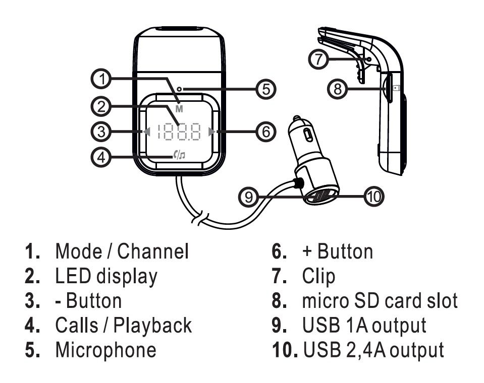 Az FM-adó töltőként, kihangosítóként és zenelejátszóként működik egyben. USB interfész vagy memóriakártya segítségével könnyedén töltheti a készüléket, és nem utolsósorban telefonálhat. A mobiltelefonnal való párosítás Bluetooth-on keresztül történik. A telefonhívásokhoz a készülék beépített mikrofonnal van felszerelve, a hívás hangja a rádióba kerül. Az adó LCD kijelzővel és vezérlőgombokkal van felszerelve a funkciók egyszerű kezeléséhez. Az elhelyezést egy kapocs segíti, amely például a szellőzőrácsba illeszkedik. A készülék kompatibilis az összes 12/24V-os szivargyújtó aljzattal az autókban és teherautókban.