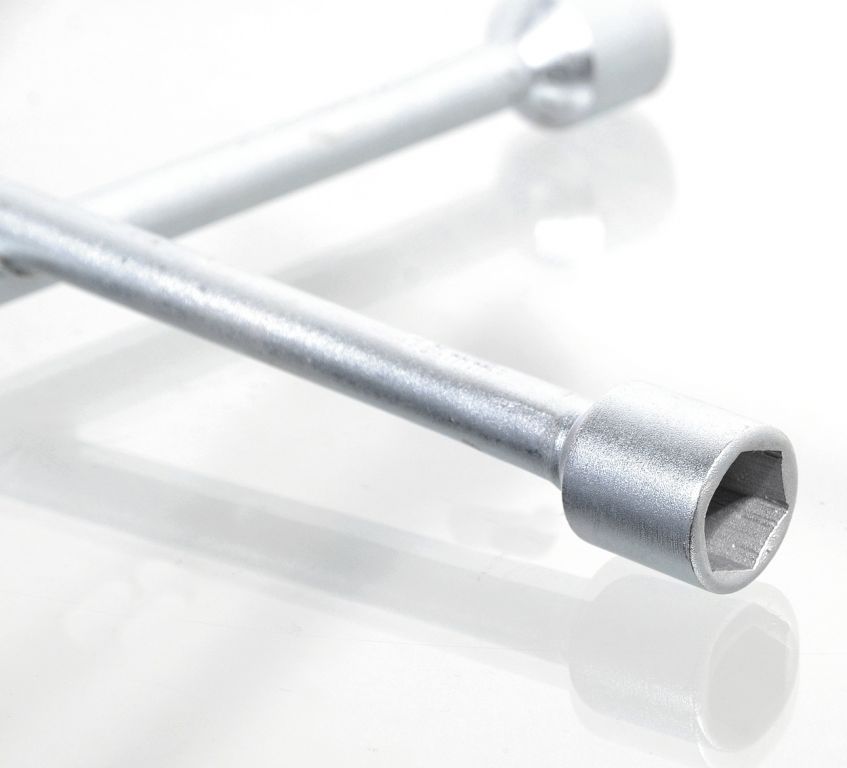 Teljesen fém kereszt alakú csavarkulcs, amely az autó kerékanyáinak meglazítására vagy meghúzására szolgál. Kiterjesztésekkel van felszerelve a kerékanyák vagy csavarok egyes oldalain történő meghúzásához és lazításához.