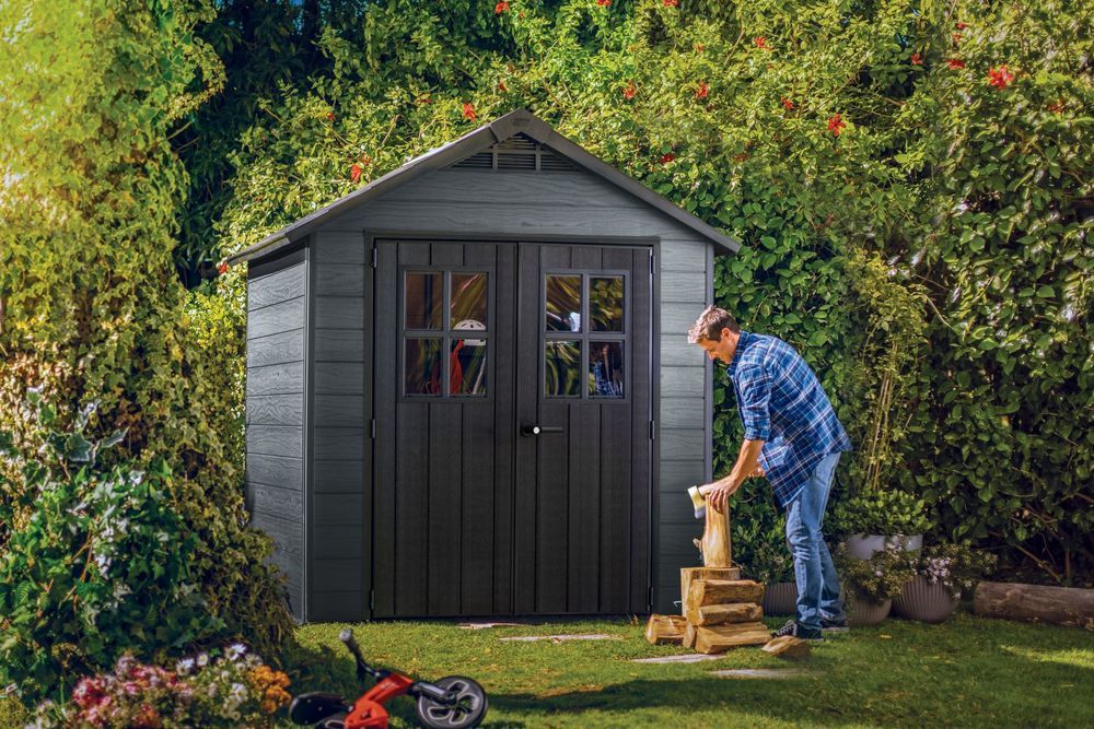 A ház tömör kialakítású tetővel, széles dupla ajtókkal és igényes igénybevételre alkalmas padlóval rendelkezik, 150 kg/m2 teherbírással. A modern és fa elemeket ötvözi az időjárás viszontagságaival szembeni nagy ellenállással. Minden Keter ház rendkívül tartós padlóval van felszerelve. Előnyök: duplafalú szerkezet, acél erősítésű tetőfedés, robusztus dupla ajtók, magas mennyezet, első, hátsó és oldalsó szellőzőnyílások, acél zárrendszer (a zár nem tartozék).
