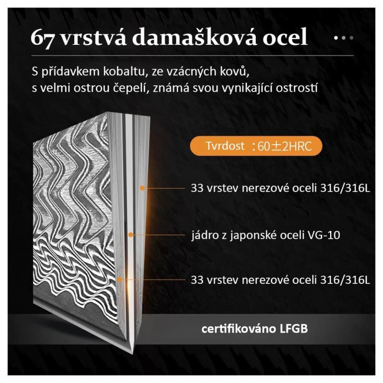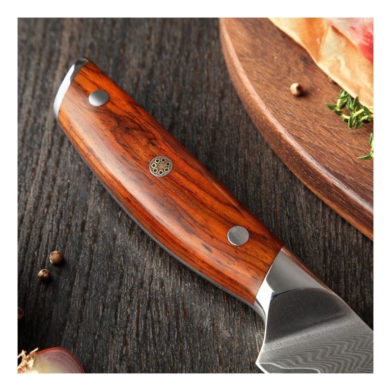 Ezeknek a gyönyörű és kiváló minőségű késeknek a markolata nagyon vonzó rózsafából készült. A markolat úgy van kialakítva, hogy tökéletesen illeszkedjen a kézbe és kényelmet nyújtson. A kések tökéletesen kiegyensúlyozottak és megakadályozzák a kéz fáradását. A védő speciálisan kialakított formája alkalmas az ázsiai kések fogására. A háromszoros szegecselés erős kapcsolatot biztosít a damaszkuszi acél és a markolat között.