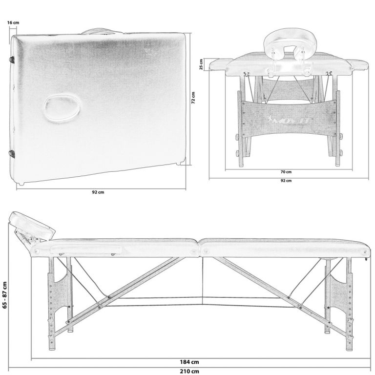 Hordozható masszázságy, amely felkínál önnek szinte mindent, amit csak kívánhat relaxáció közben. Levehető, magasságban állítható fejtámasszal, levehető kartámasszal és 9 fokozatban állítható magassággal rendelkezik. Robusztus konstrukció bükkfából, átlós sínekkel és acél huzalokkal, melyek biztonságot és stabilitást biztosítanak. A felület anyagának köszönhetően egyszerűen eltávolítható izzadság, víz és masszázsolaj is. Könnyen és gyorsan felállítható, valamint összecsukható. Hordozható tok a csomag tartalma, melyben tárolhatja a masszázságyat és egyben védi is azt.