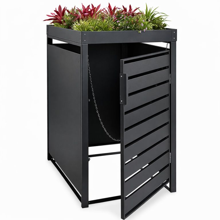 A STILISTA hulladékgyűjtő szekrény egy szemetesnek kínál helyet, legfeljebb 240 literes kapacitással. A kukaszekrény tetején található növényrekeszeknek köszönhetően tetszés szerint szépítheti azt. A növények számára kialakított vízelvezető lyukak a tetőn lehetővé teszik a jobb vízelvezetést, így a virágokat és fűszernövényeket nem fenyegeti a pangó víz veszélye. A hasznos szellőzőnyílások lehetővé teszik a levegő keringését, és megakadályozzák a kellemetlen szagok kialakulását a burkolatban. A szemetesház egy, két, három vagy négy szemeteshez kapható.